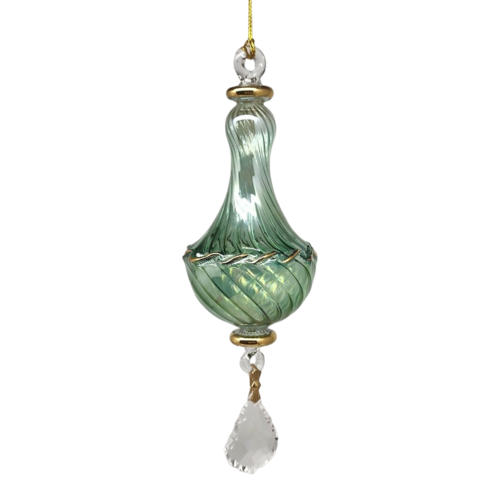 This stunning ornament combines graceful curves with delicate artistry, handcrafted from mouthblown German Pyrex glass in Egypt. The elegant teardrop shape features swirling emerald-green hues that catch the light beautifully, giving it a mesmerizing glow reminiscent of a jewel. Accented with real 24K gold detailing that delicately wraps around the ornament and highlights its top and bottom rings, this piece embodies a regal sophistication that complements any Christmas tree or festive décor.