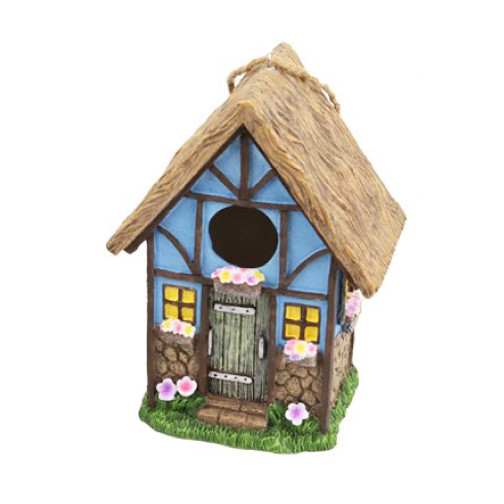 Bring charm and whimsy to your garden with our Resin Blue Cottage Bird House! This delightful birdhouse, designed to look like a cozy cottage, is perfect for welcoming feathered friends into your outdoor space.