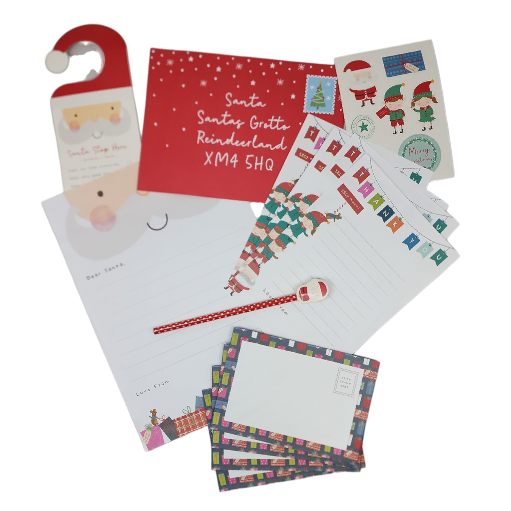 - Includes: 1 Letter to Santa, 1 Envelope, 1 Pencil with eraser, 1 Sticker Sheet, 1 Door hanger, 5 Thank you notes with envelopes