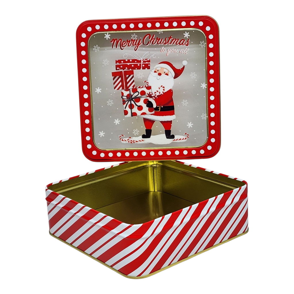 Celebrate the spirit of giving with our Santa's Gift Cookie Tin! This festive square tin features a cheerful Santa Claus joyfully carrying presents, making it an ideal storage solution for your holiday treats. With the fun message "Merry Christmas to you all" inscribed on the front, this charming tin captures the essence of the season and is perfect for sharing sweet goodies with friends and family. The acetate window allows you to showcase the delicious contents, adding a twinkle of excitement for everyone eager to see what’s inside.