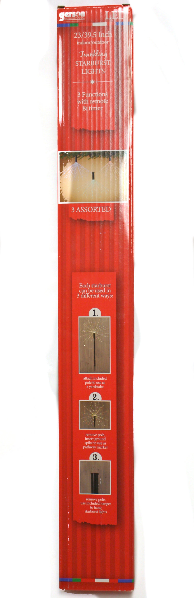 23/39.5" Twinkling starburst light with 3 functions and a remote and timer. Can be used in 3 different ways as a yard stake pathway maker or hung!
