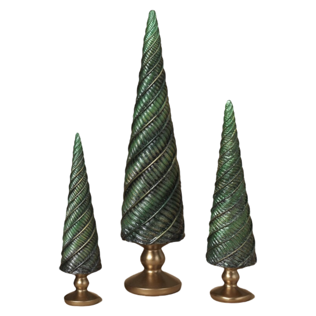 Elevate your holiday decor with our stunning Elegant Resin Holiday Trees, available for purchase individually! These beautifully crafted trees come in three sizes—standing at 13.5 inches, 9.5 inches, and 8 inches tall—offering a stylish and sophisticated touch to your festive displays. Each tree features a rich green finish and intricate spiral detailing that captures the essence of a lush evergreen, while the elegant bronze bases add a touch of warmth and elegance to any setting.