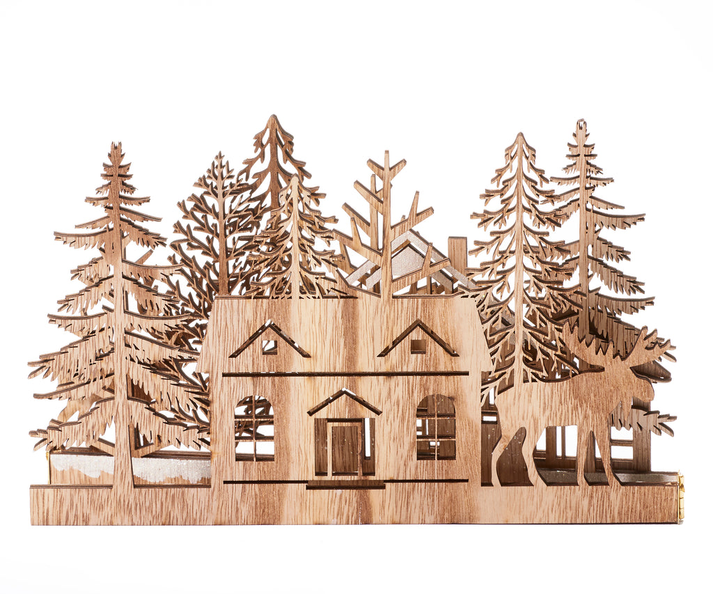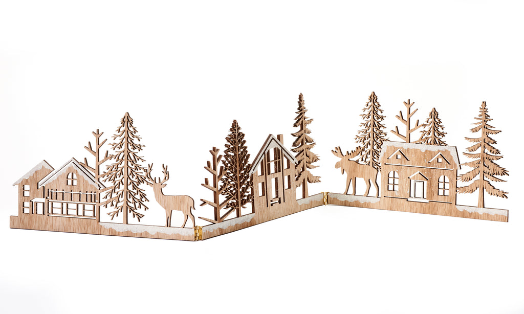 Decorate a tabletop with this seasonal screen, detailed with moose, reindeer, cabins and pine trees all detailed with a sprinkling of glittery snow. Plywood, Metal.