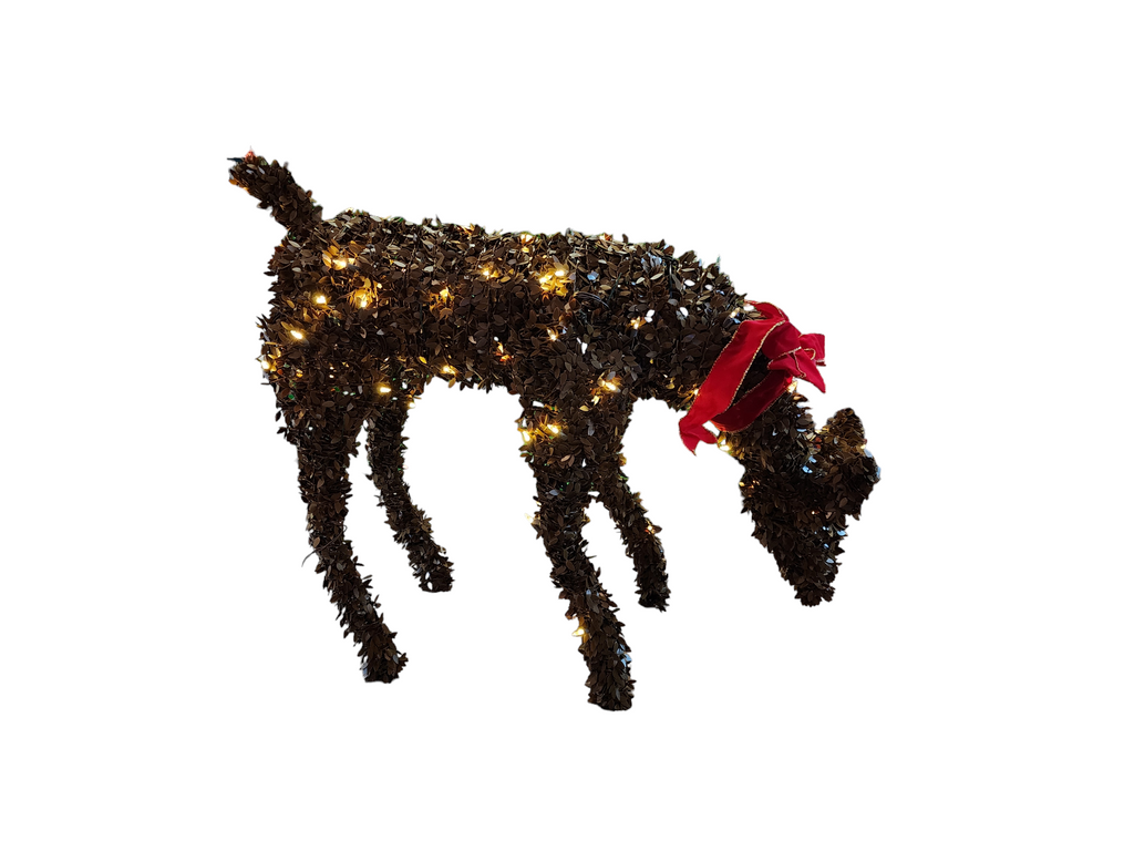 Add this magnificent doe to your yard to chase away the dark. Made from brown pvc leaves and wire for outdoor durability, this doe is ready to be hitched up to a decorative sleigh across your yard for a natural woodland outdoor display. Add other deer or outdoor decor to create a winter scene that will delight your friends and guests. A warm white string-light adds sparkle to the holiday accents with a large red velvet bow. Celebrate the winter season with this deer, which can be left in the yard for your enjoyment all winter long.