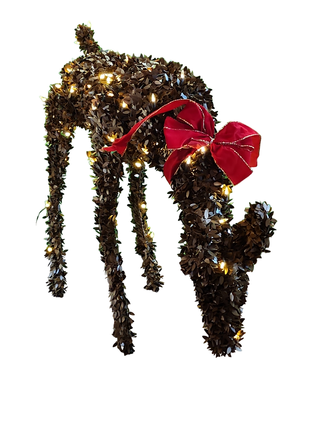 - Electric indoor outdoor standing buck is made of metal and pvc leaves, with a red holiday bow, brightly lit it measures 44 inches long