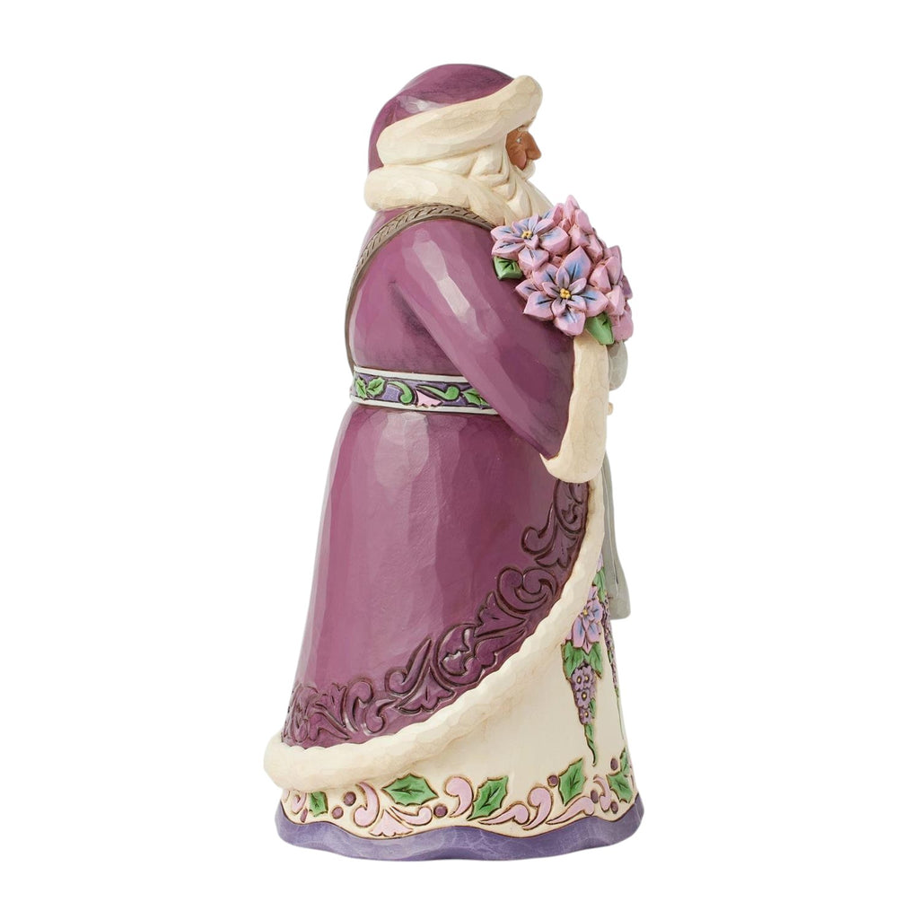 Celebrate the season in style with Jim Shore's captivating Royal Holiday Cheer Purple Poinsettia Santa! This charming Santa figure stands 10.5 inches tall, showcasing a beautiful blend of vibrant purples and intricate floral designs that capture the magic of the holidays. Holding a lovely bouquet of poinsettias—traditional symbols of Christmas joy—this figure radiates warmth and cheer, making it a delightful addition to your holiday décor.