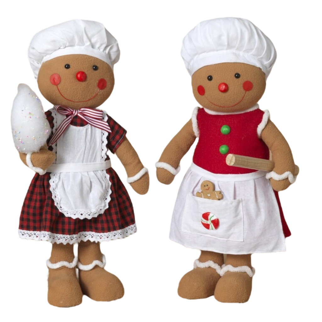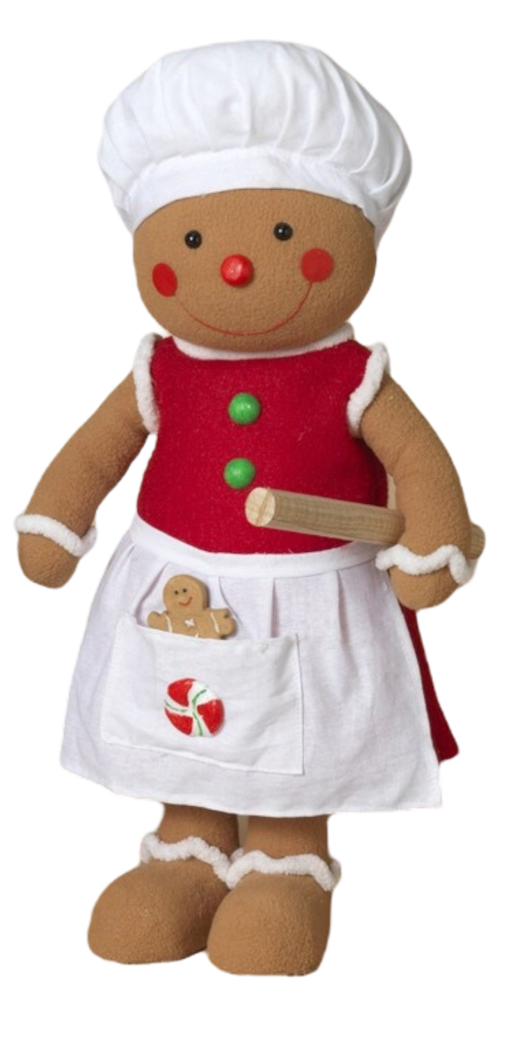 Delight in the cozy charm of the Cookies & Carols Gingerbread Girl! This enchanting figure also stands 19.5 inches tall and features a bright red dress adorned with festive accents and a cheerful pocket filled with a gingerbread cookie and a candy cane. Sporting a classic white chef's hat and an infectious smile, she captures the essence of holiday baking and cheerful caroling.