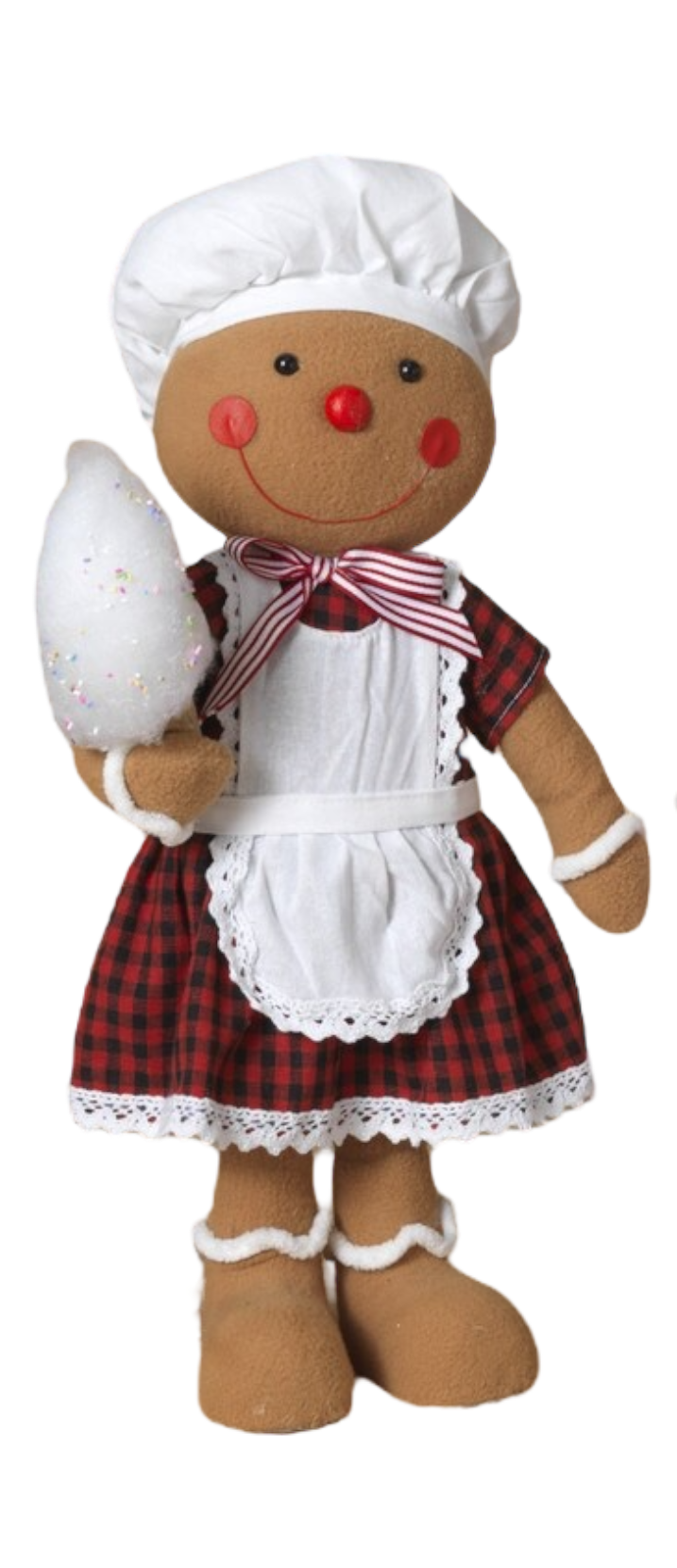 Embrace the sweet spirit of the holidays with the Candy Shop Gingerbread Girl! Standing at an adorable 19.5 inches tall, this charming figure is dressed in a delightful red and black plaid dress, complete with a white apron and a playful chef's hat. Holding her sugary cotton candy, she embodies the joy and whimsy of a bustling holiday candy shop.