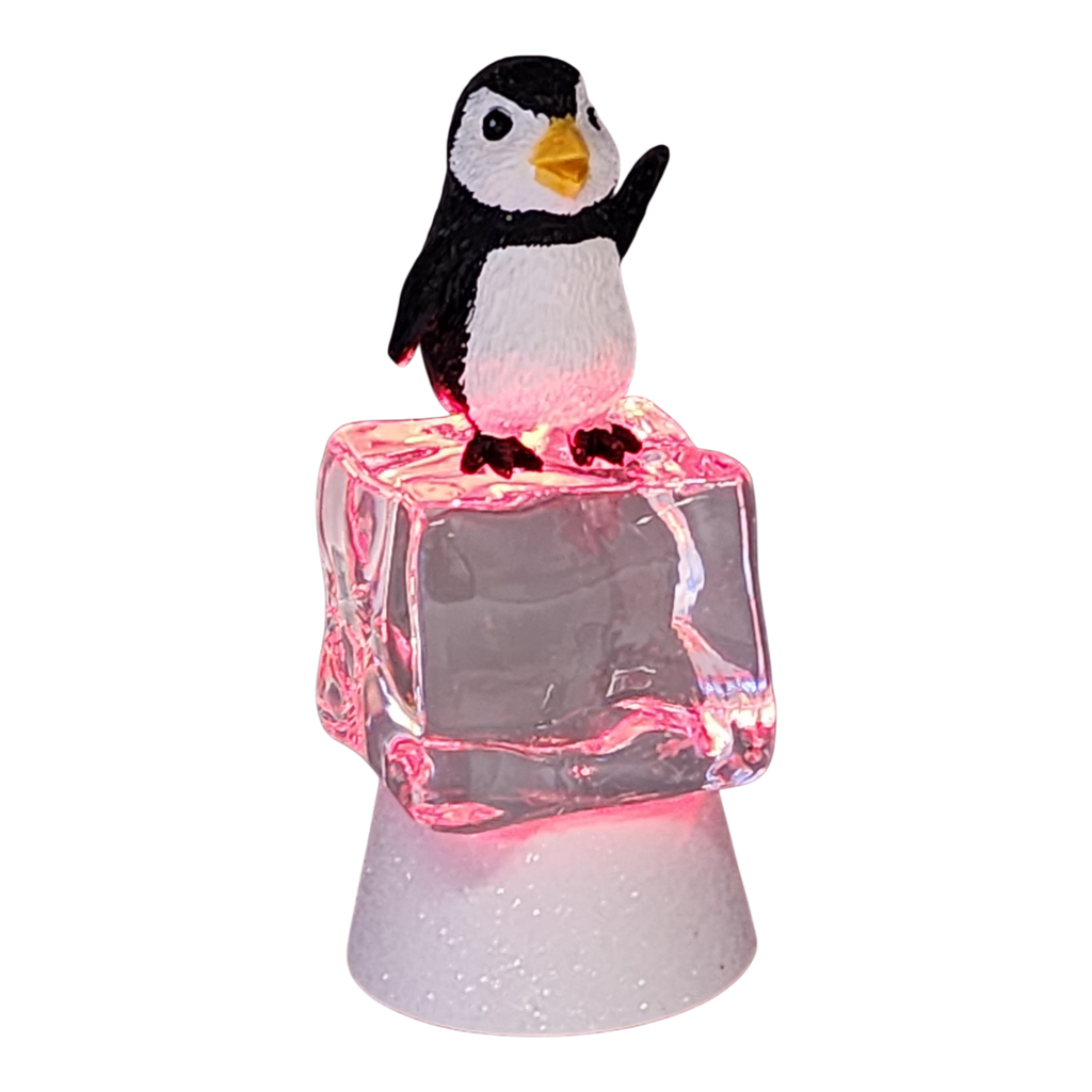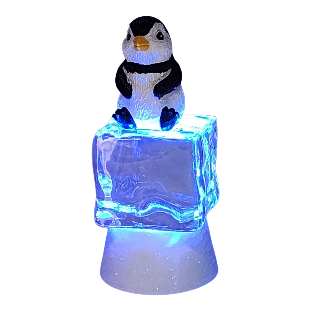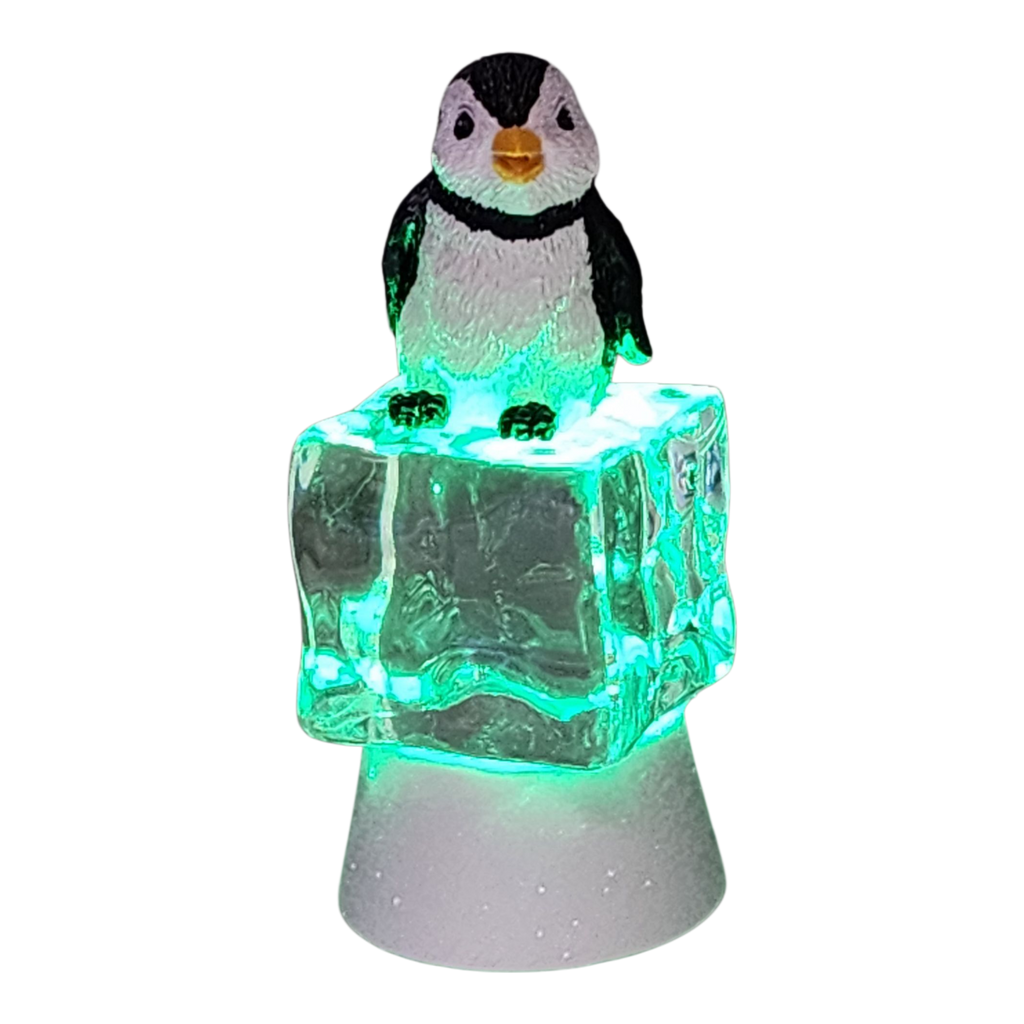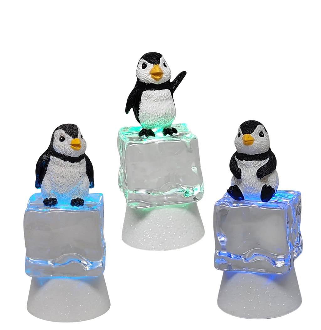 Meet the delightful trio of penguins, each perched on a shimmering ice cube that transforms colors like magic. First, there's Waddles, the lively figure who waves to all with enthusiasm, adding a playful touch to your holiday decor. Next, say hello to Pippin, the sweet and round penguin who sits cozily atop her cube, perfect for winter celebrations and making sure your space feels warm and inviting. Finally, we have Chilly, the regal penguin who stands tall and proud, bringing a sense of sophistication to any gathering, especially around New Year’s Eve as you welcome a fresh start with friends and family.