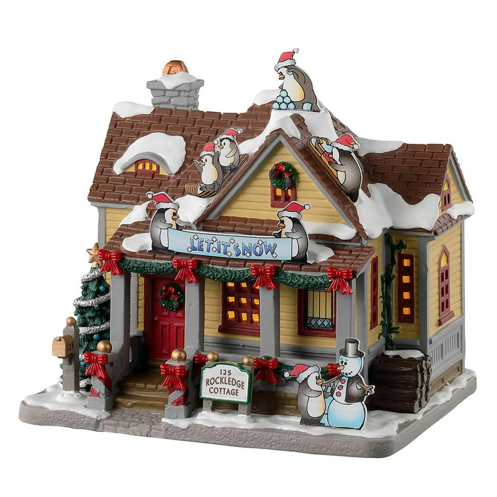 Welcome to the whimsical world of Rockledge Cottage, where holiday magic and adorableness unite! Standing at approximately 6.69 inches tall, this delightful lighted building is adorned with fanciful Christmas decorations, capturing the hearts of all who encounter it. This year’s theme features delightful penguins engaging in playful antics—sledding and making snowballs—all while sporting their festive red hats. Their child-like joy brings an air of enchantment to the cottage’s exterior, inviting passersby to pause and admire the festive spirit.