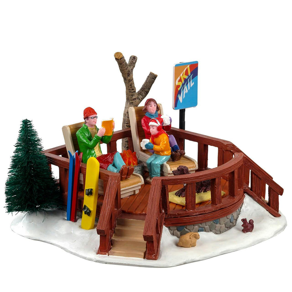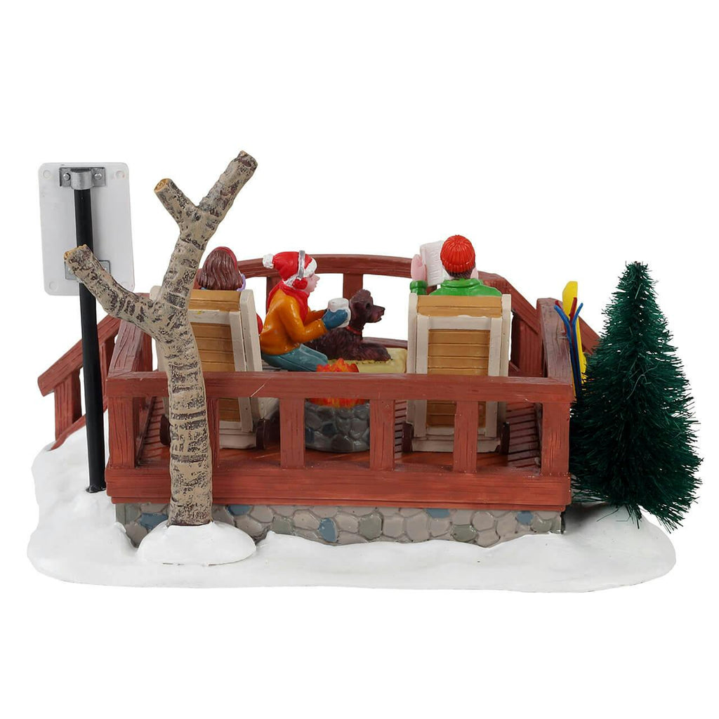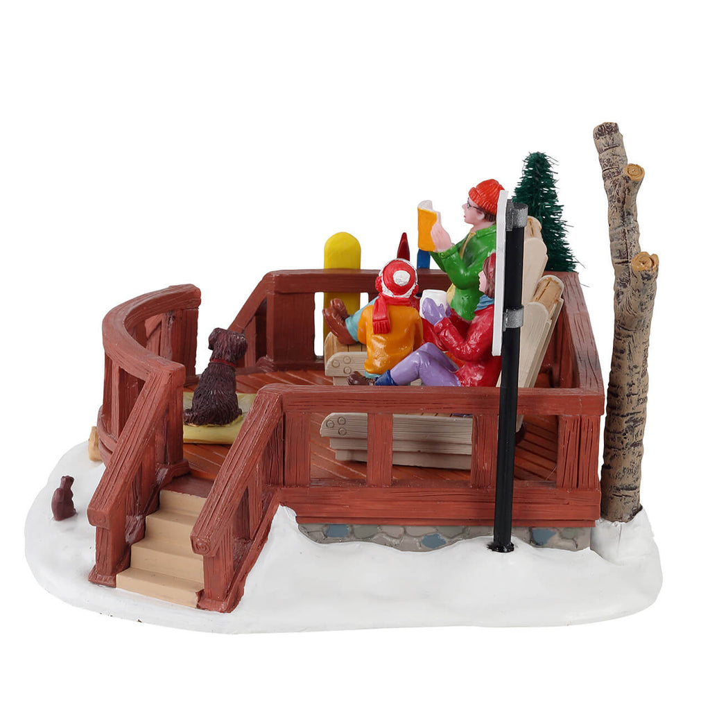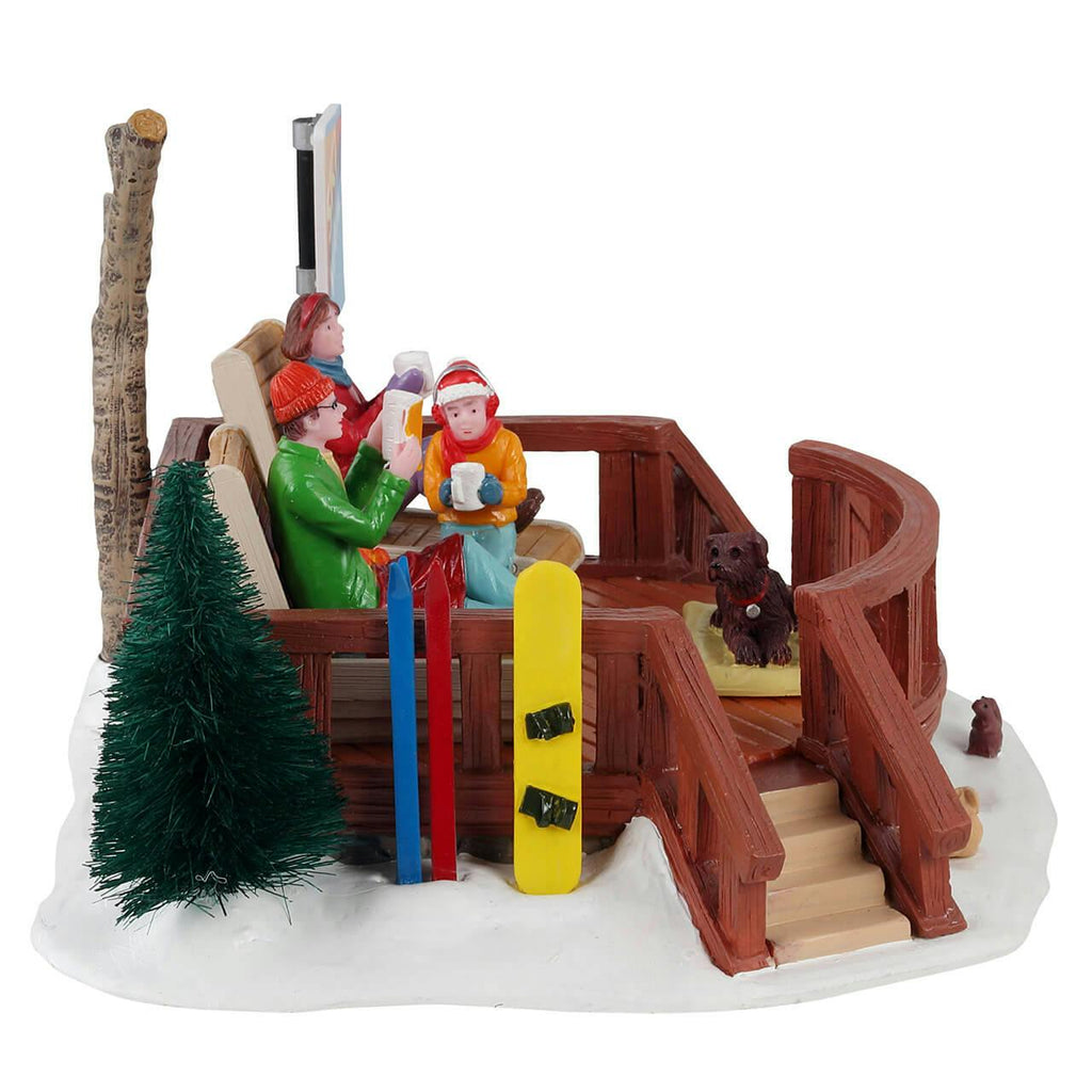 Why not enjoy some Sun On The Slopes? This family of skiers are taking a break and hanging out on a wooden deck to catch some rays. Next to the wooden deck is a pine tree and a wooden stump. The dad is sitting on a lounge chair while reading a book. Mom and son are sharing the second lounger and they're enjoying a warm drink before heading back out on the slopes.