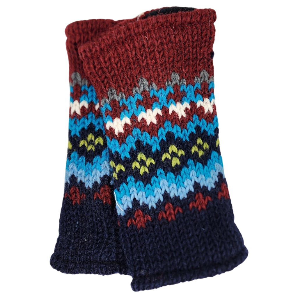 Stay warm without sacrificing dexterity with the Ridgeline Fleece Lined Handwarmer in the Horizon design. These fingerless gloves are hand-knit in Nepal from 100% sheep wool and lined with soft Sherpa fleece, offering cozy insulation while keeping your fingers free for texting, crafting, or sipping cocoa. The Horizon pattern features rich maroon cuffs and a vibrant mix of blues, greens, and whites in geometric bands—like a festive mountain skyline at dusk.