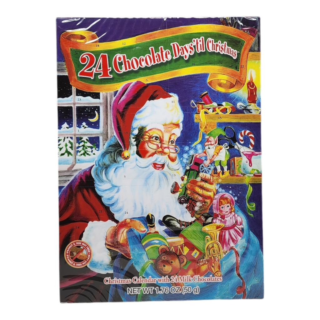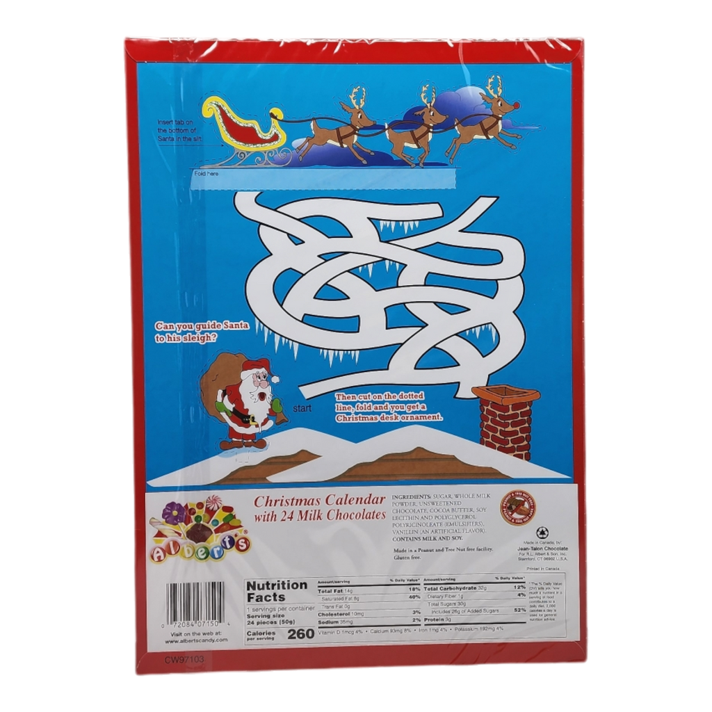 A traditional Christmas Advent Calendar from Albert's Candy. Each Calendar has 24 windows, each with a piece of Milk Chocolate behind the window