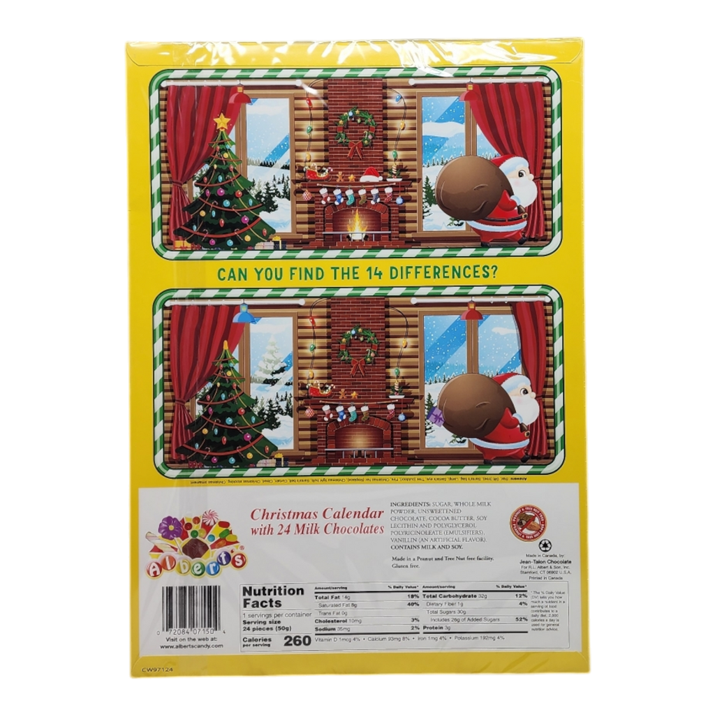 A traditional Christmas Advent Calendar from Albert's Candy. Each Calendar has 24 windows, each with a piece of Milk Chocolate behind the window.