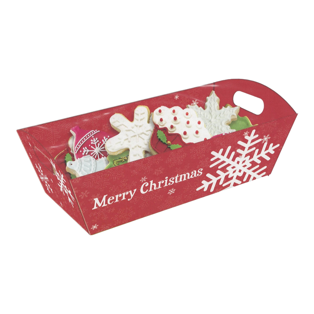 Celebrate the season with this Snowflakes on Red Cookie Tray with Cello Wrap, a festive and easy way to share your holiday baking. The tray features a bright red background adorned with white snowflakes and a cheerful “Merry Christmas” message, making it perfect for gifting cookies, candies, or homemade treats. With the included clear cello wrap, coordinating tag, and twist tie, your gift is ready to go in minutes—no extra wrapping required.