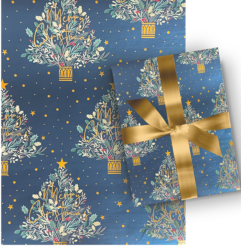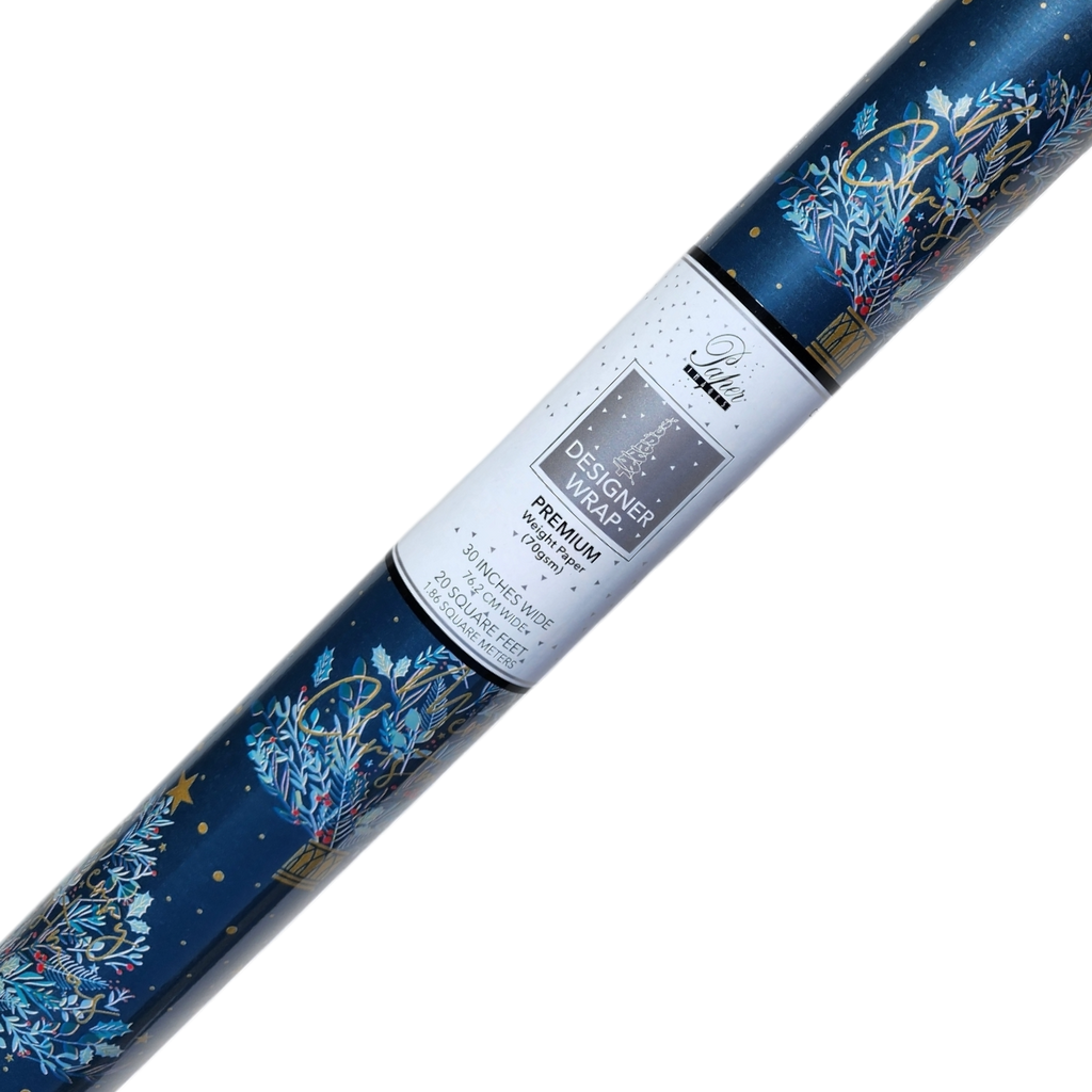 Deck your gifts in unparalleled elegance with the Starry Night Splendor Gift Wrap! This premium designer wrap boasts a stunning deep blue canvas adorned with majestically ornate Christmas trees, twinkling golden stars, and artful calligraphy that invokes the magic of the holiday season. Measuring a magnificent 30 inches wide and 96 inches long, it provides ample space to cater to gifts of all sizes, because no present is too big or too small for a touch of splendor.