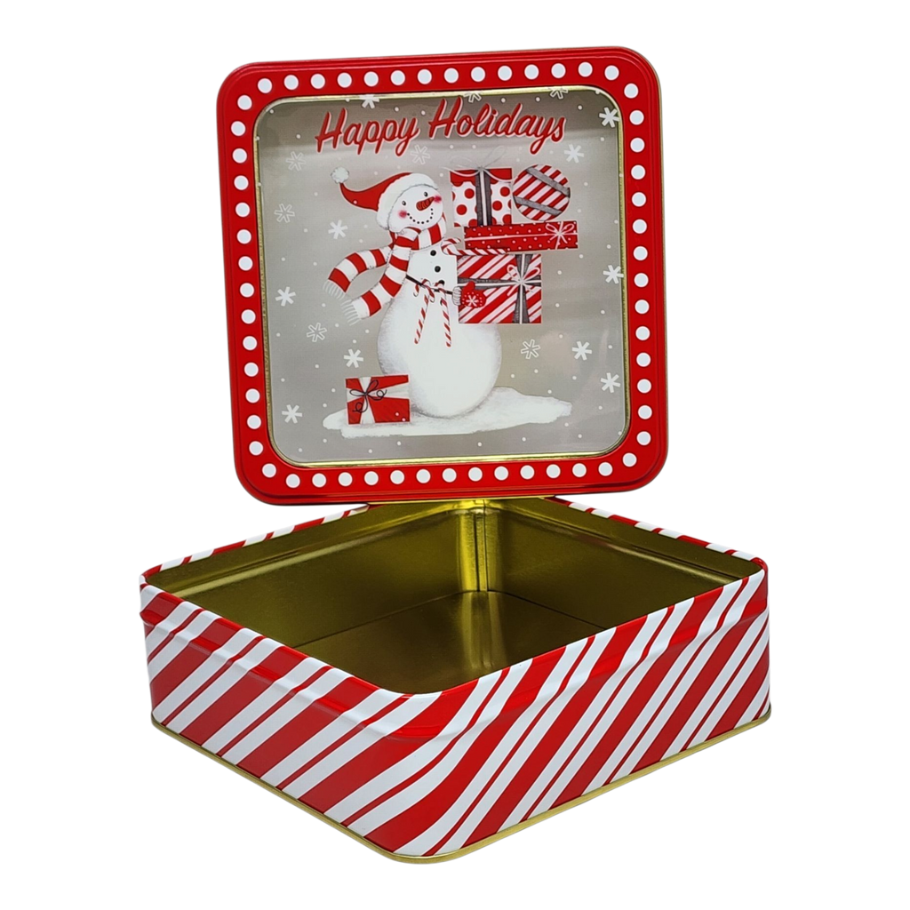 Square Cookie Tin with Window - Happy Holidays Snowman