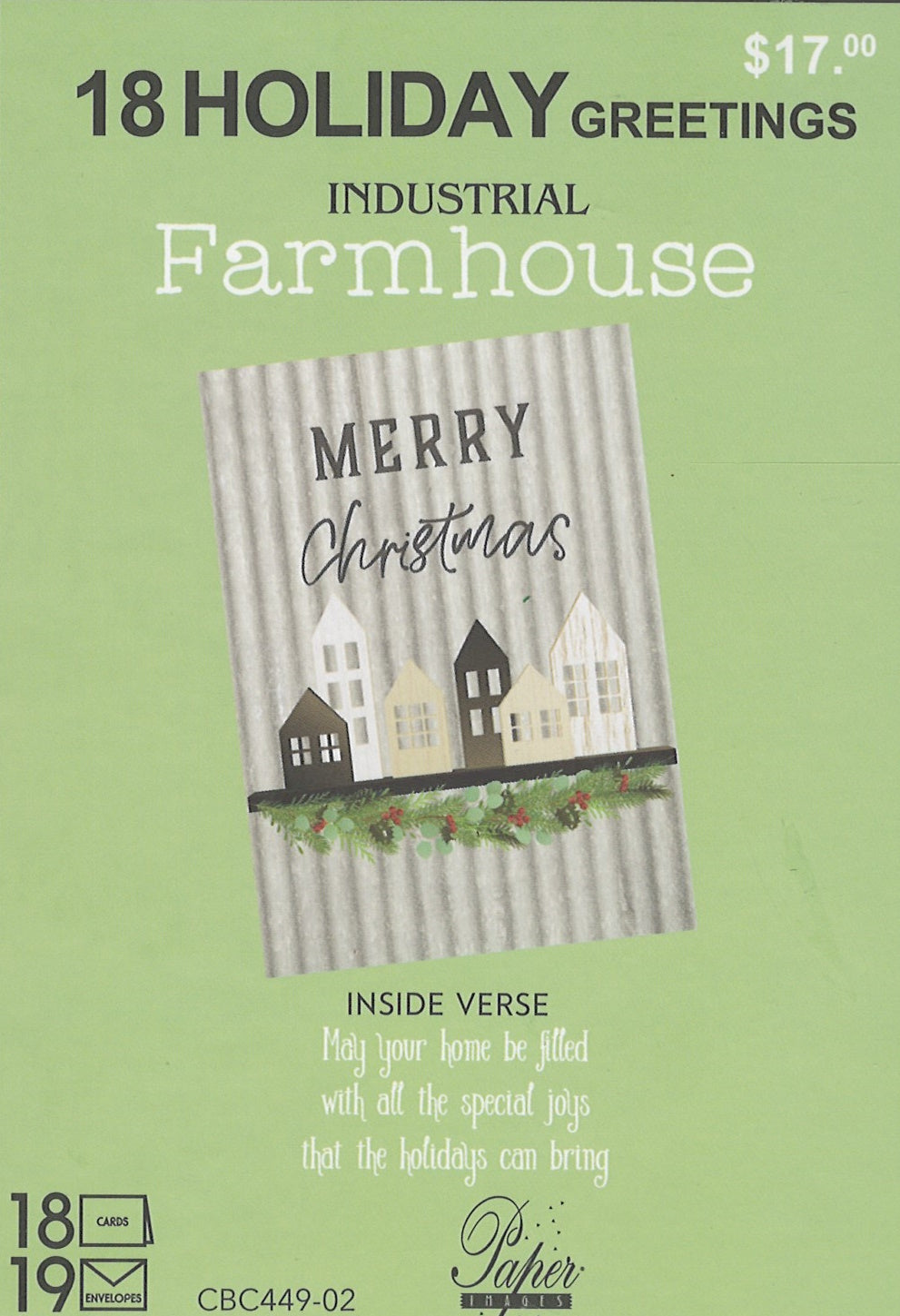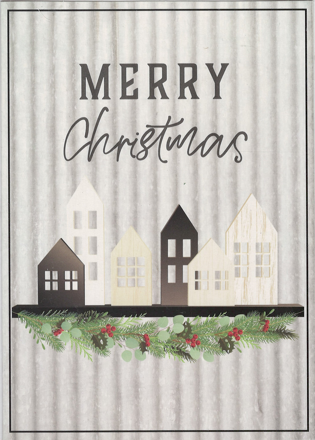Celebrate the warmth of home with this boxed set of 18 holiday cards featuring a charming village scene set against a corrugated backdrop. The front reads “MERRY Christmas” in rustic green and red lettering, surrounded by cozy houses and winter greenery. The industrial farmhouse aesthetic blends texture and tradition, making these cards perfect for sending heartfelt wishes to loved ones near and far.