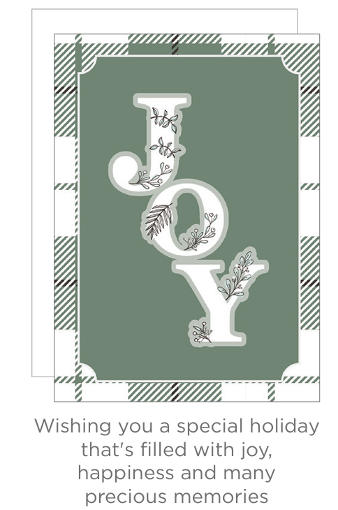 Celebrate the season with the Botanical JOY design from the Wonders of Winter Collection. This elegant card features the word “JOY” in large, stylized white letters, each adorned with delicate botanical illustrations. Set against a muted green background with a white-and-green plaid border and ornate corner detailing, it’s a refined way to send heartfelt holiday wishes.