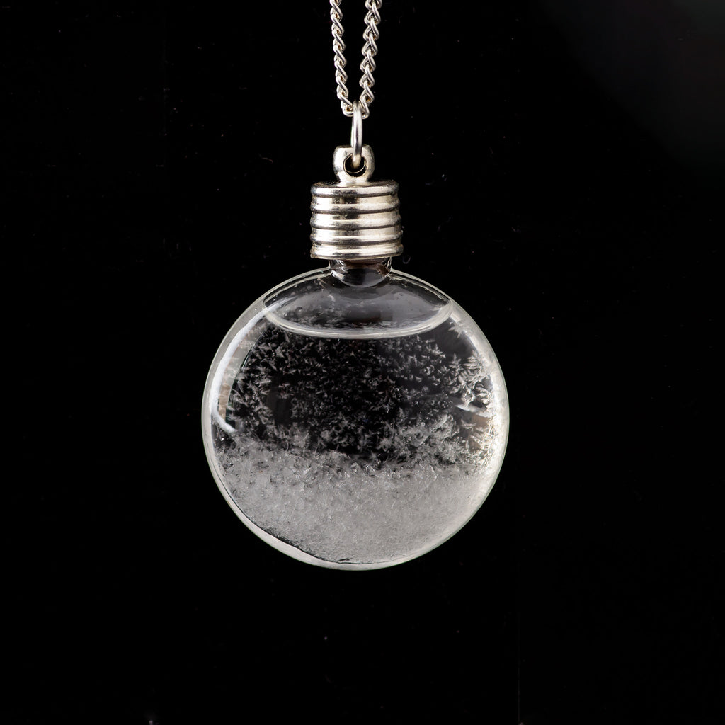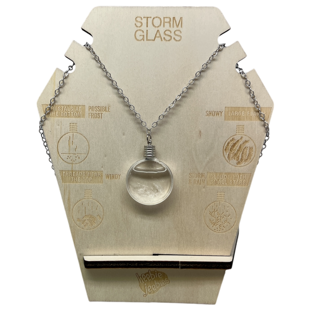 Discover the beauty and practicality of the Necklace Storm Glass, a charming accessory that combines style with function. Suspended from a sleek silver-plated chain, this pendant features a 1.5-inch storm glass that serves as a historical weather-predicting device, originally popularized by Admiral Robert Fitzroy after his famous voyage on the HMS Beagle.