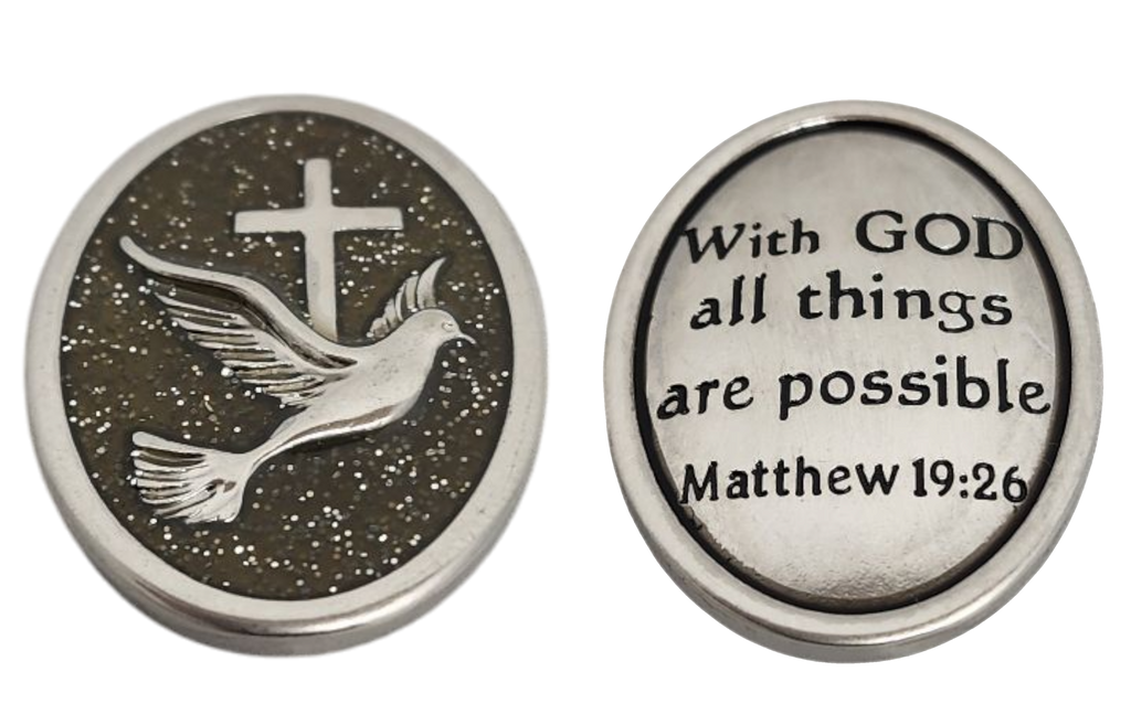 Dove Token: Displays a dove carrying a cross. The back reads, “With God, all things are possible.” (Matthew 19:26) A perfect affirmation of faith.
