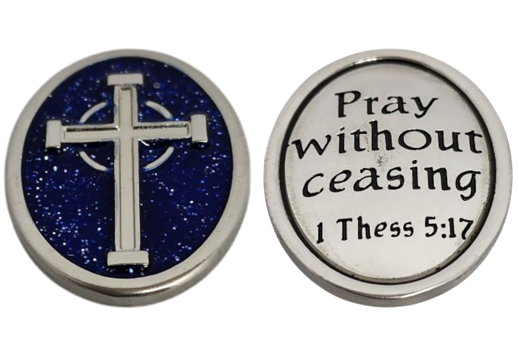 Cross Token: Displays a traditional cross surrounded by beautiful accents. The reverse states, “Pray without ceasing.” (1 Thessalonians 5:17), reminding us of the power of consistent prayer in our lives.