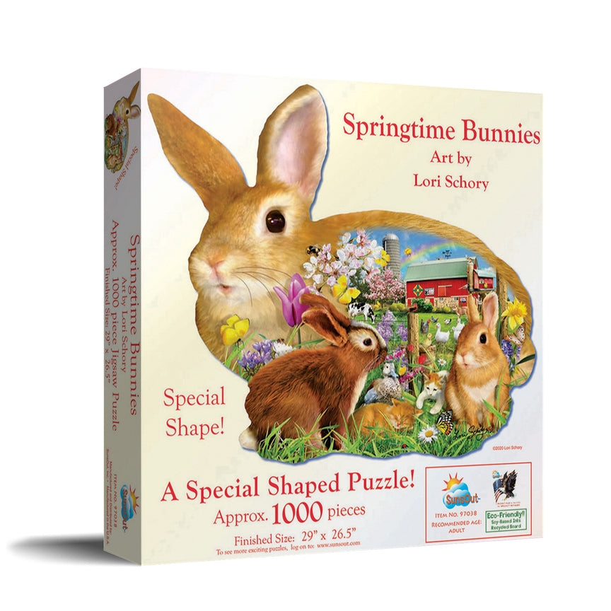 Welcome spring with the delightful "Springtime Bunnies" jigsaw puzzle by Lori Schory. This special-shaped puzzle features approximately 1,000 pieces and forms a charming 29" x 26.5" scene. Immerse yourself in a pastoral setting filled with adorable bunnies amidst blooming flowers, vibrant greenery, and a picturesque barn. The intricate design celebrates the beauty and renewal of spring, offering a joyful and engaging challenge. Crafted from eco-friendly recycled board and soy-based inks, this puzzle combines artistry with sustainability. Perfect for puzzle lovers seeking a unique and heartwarming experience.