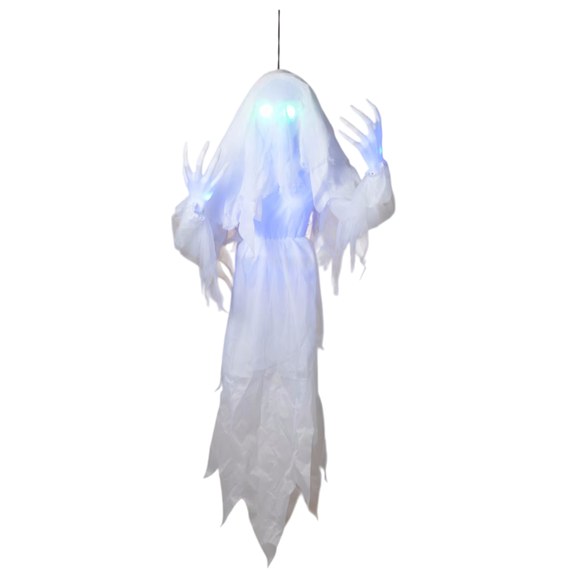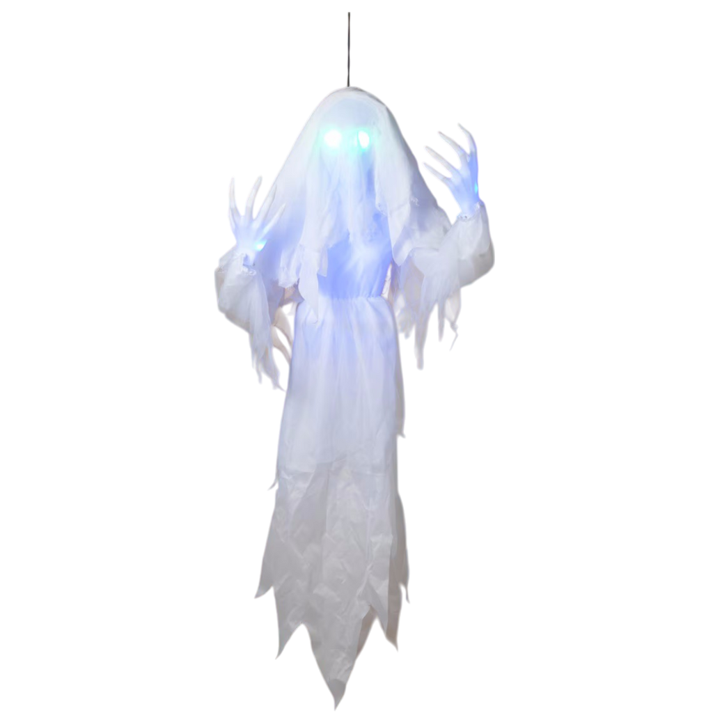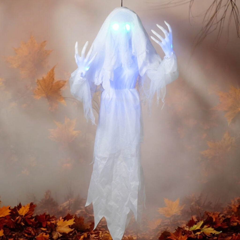 Get ready to haunt your Halloween festivities with our Spooky Sound-Sensing Ghost! This chilling figure, complete with flowing white fabric and eerie design, adds a spine-tingling effect to any room or outdoor space. Measuring in at an impressive 5 Feet tall, this ghost features glowing eyes that light up as it hears a loud sound, heightening the suspense and surprise for your guests. Imagine the thrills as it springs to life with spooky sound effects and haunting phrases, drawing everyone into an interactive fright experience!