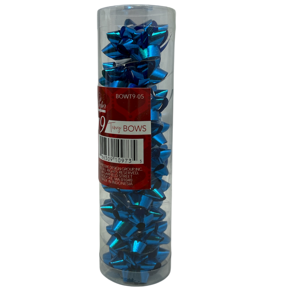 Add a bold splash of holiday color with this tube of 9 tiny royal blue metallic bows. Each bow measures just over 1 inch across and features a peel-and-stick backing for quick, no-fuss decorating. The rich blue finish and classic ribbon styling make them perfect for gift bags, boxes, and festive crafts.