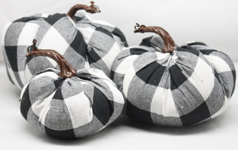 3 Fabric pumpkins with a black and white plaid patterned fabric.