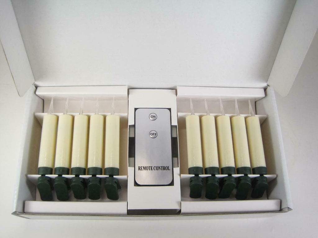 - Set of 10 battery operated candles with clips to attach to a wreath, tree or garland.