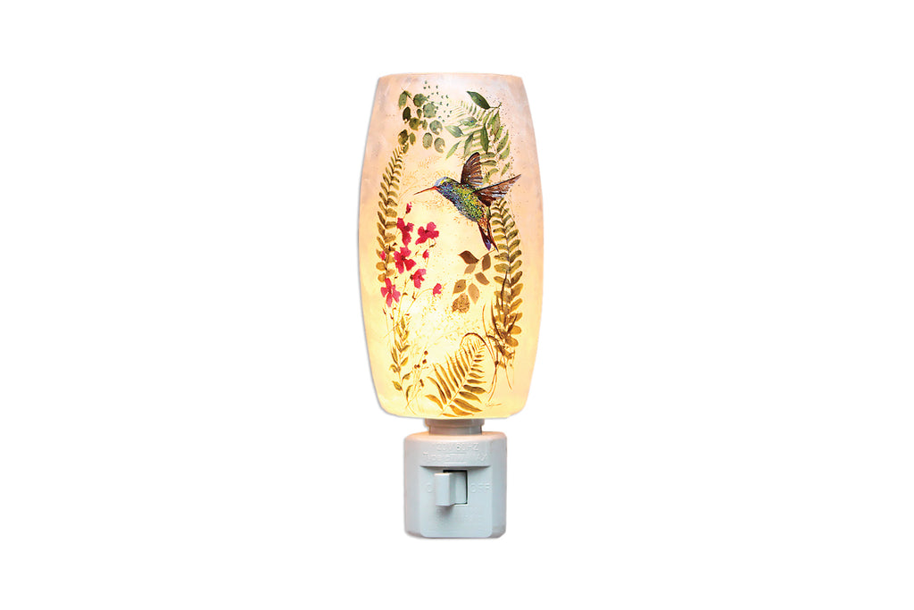 Illuminate your space with our charming Spring Greens Night Light! This delightful night light features a decorative frosted glass cover beautifully adorned with a vibrant hummingbird and floral design, bringing a touch of nature indoors. Measuring 3.25 inches in width, 2 inches in depth, and 6 inches in height, it’s the perfect size to add a warm, inviting glow to any room.