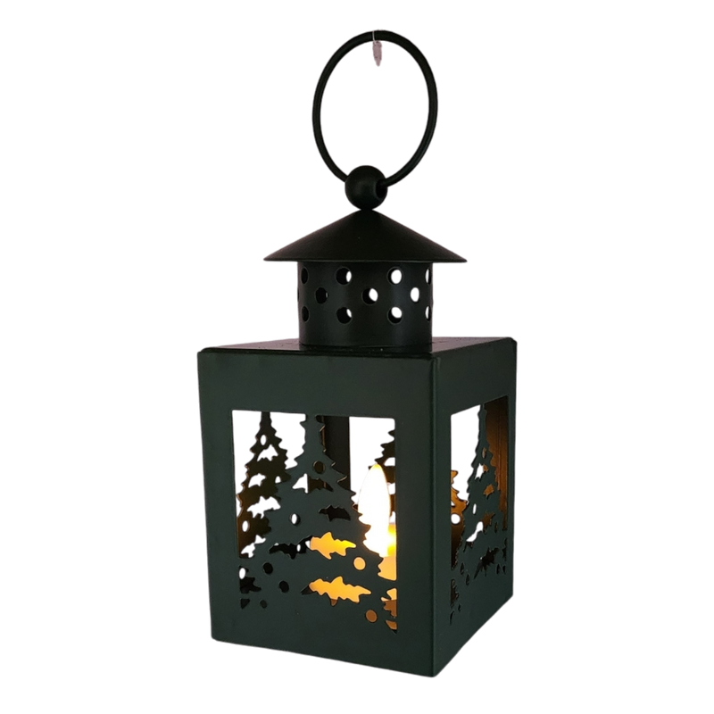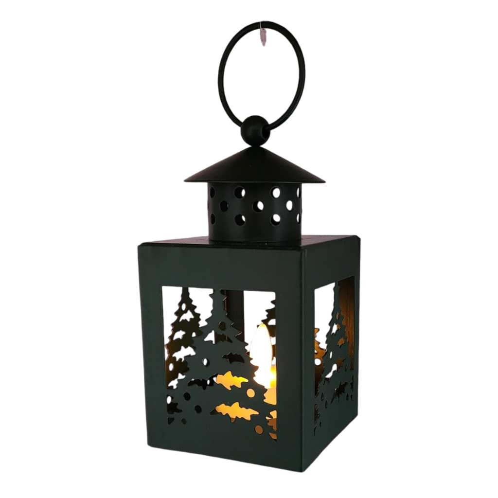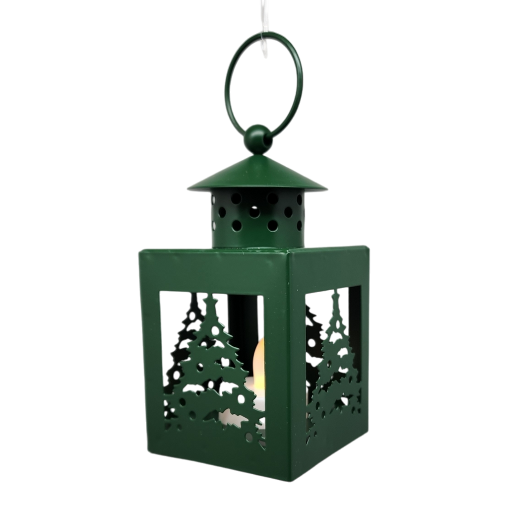 Illuminate your holiday festivities with the enchanting glow of our 4.9" Battery-Operated Lighted Metal Holiday Lantern. Painted a festive green, this sturdy metal lantern features beautifully cut-out designs of Christmas trees on each side, creating a charming woodland scene perfect for the holiday season.