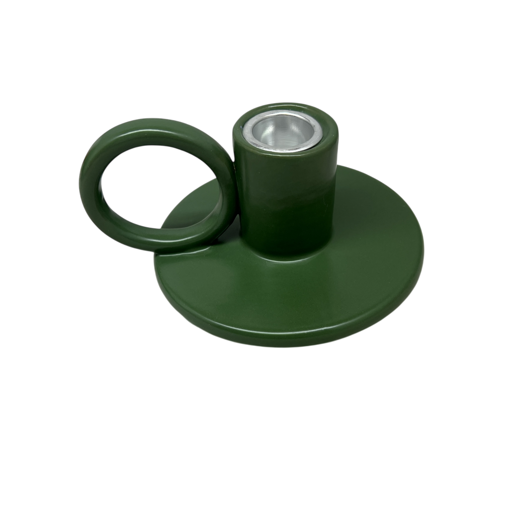 This deep green candle holder adds a rich, earthy tone to your seasonal décor, with a glossy finish and a classic silhouette that feels both vintage and modern. Crafted from durable dolomite, it features a circular base and a wide loop handle for easy carrying—perfect for creating cozy ambiance in any room. The metallic inner ring at the top adds a subtle touch of shine while helping secure your taper candle in place.