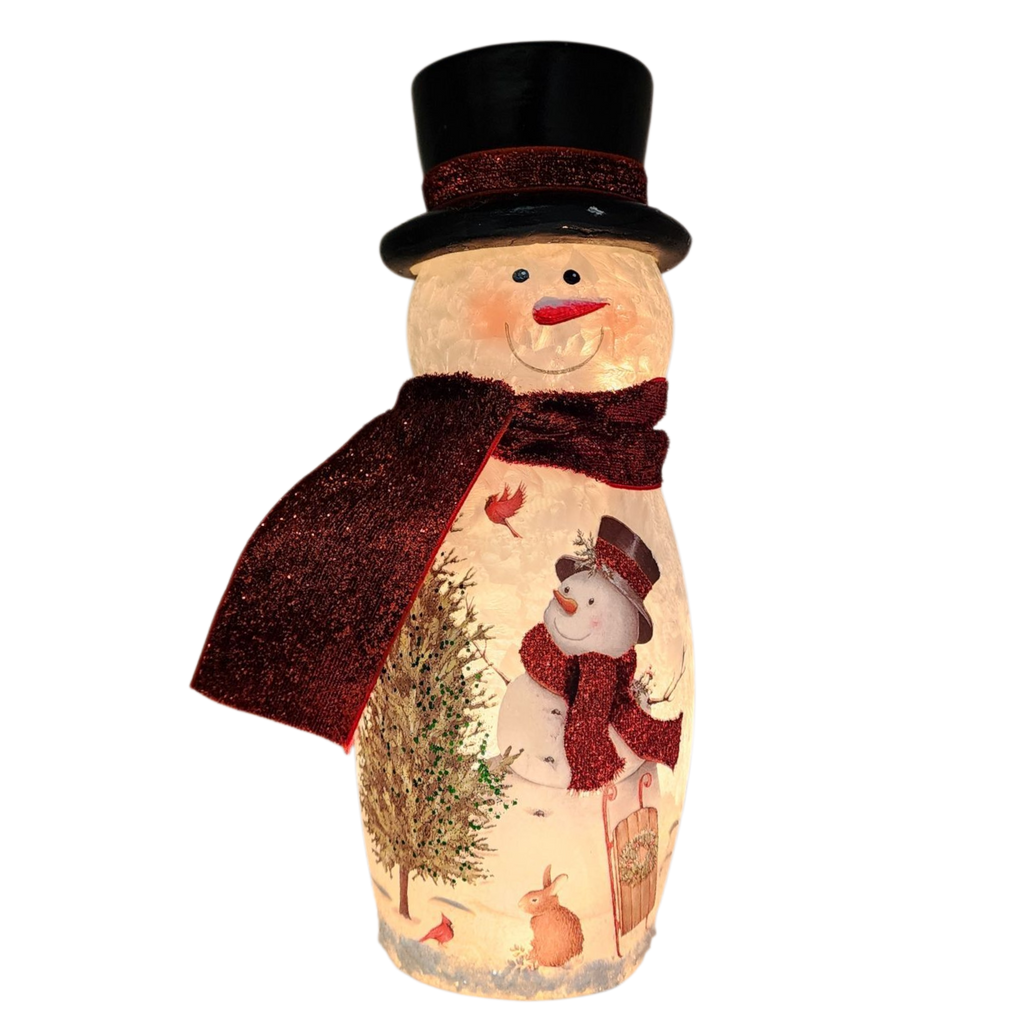 Delightful Snowman - - Beautifully decorated frosted Glass Vase. The Jar has a set of 11 warm white lights within to create an amazing Accent Lamp.
