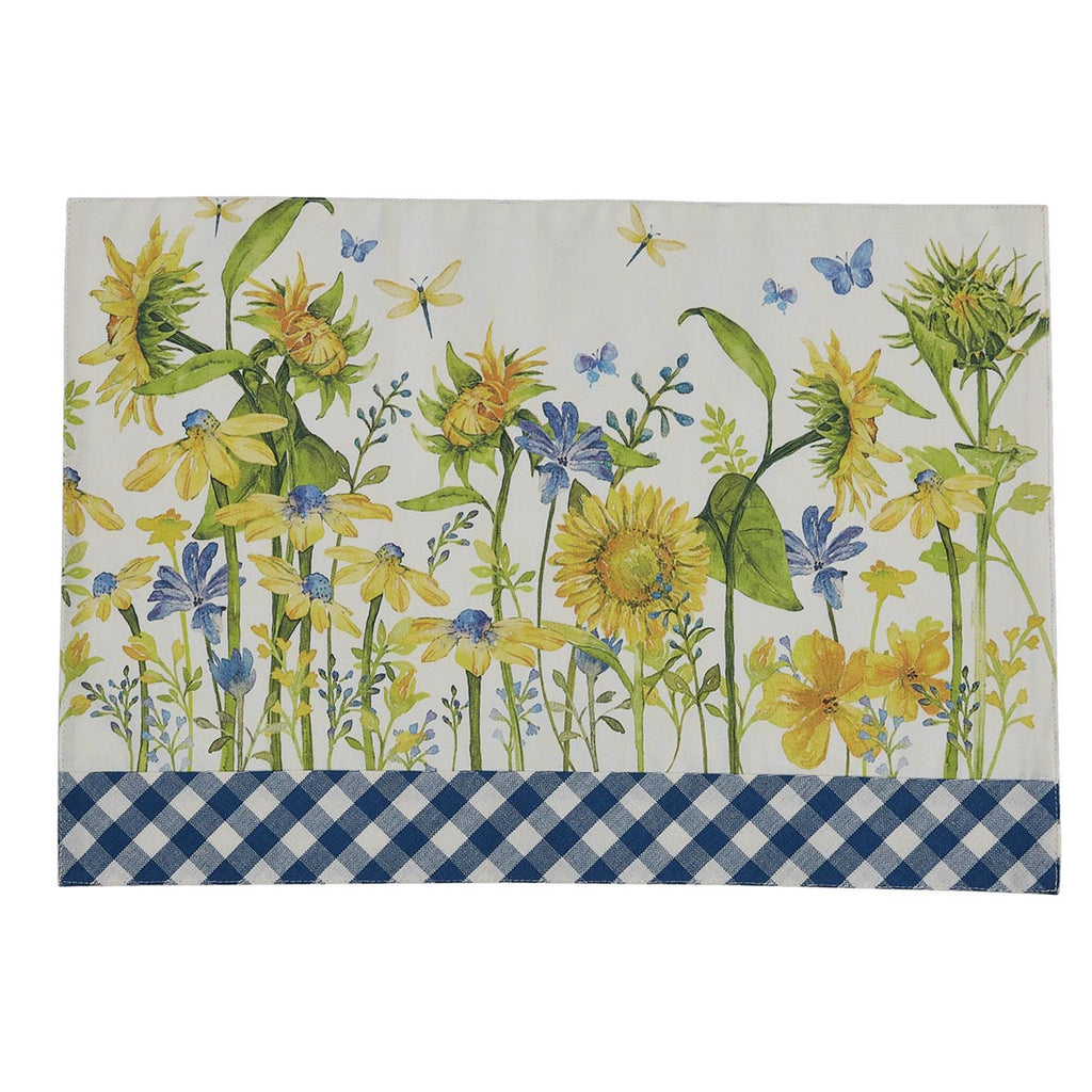 Brighten up your dining table with the cheerful Sunny Day Placemat! Measuring just over 13 inches by 19 inches, this delightful placemat is crafted from soft cotton and features a stunning floral design that showcases vibrant sunflowers and playful blue butterflies amidst a lively garden backdrop. The charming gingham border adds a touch of classic appeal, making it perfect for both casual dining and special occasions.