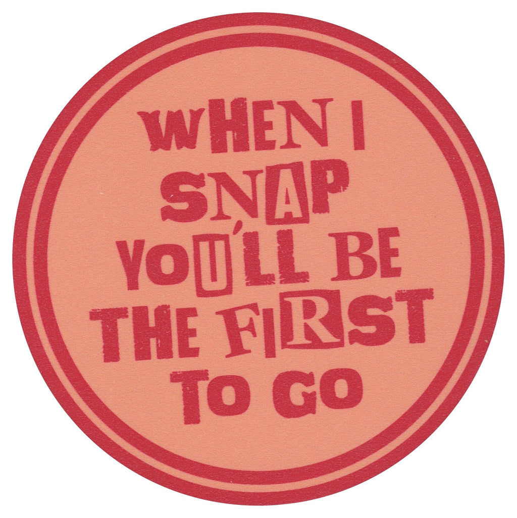 Add a dash of humor to your home with the When I Snap You'll Be the First to Go Coaster! This witty design features the cheeky phrase in bold lettering, making it a perfect conversation starter for gatherings and a fun accessory for your kitchen or bar area. It’s great for those who enjoy a bit of sarcasm in their decor, allowing you to showcase your sense of humor while protecting your surfaces from drink stains.