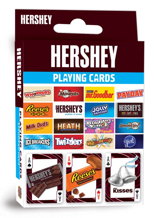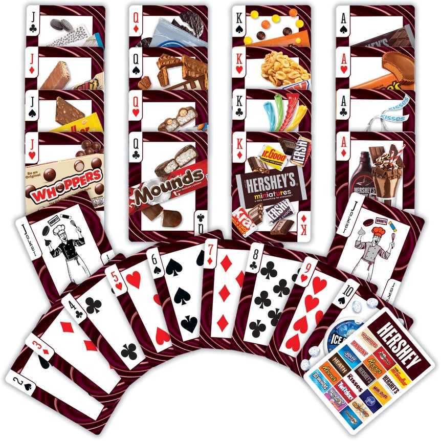 These Hershey playing cards are the perfect deck for any candy fan! Each standard deck contains 52 high quality cardstock cards and 2 jokers. Card-back designs feature the HERSHEY logo. All face cards and jokers have photographs of Hershey's sweetest candy treats. Officially licensed and approved Hershey playing cards