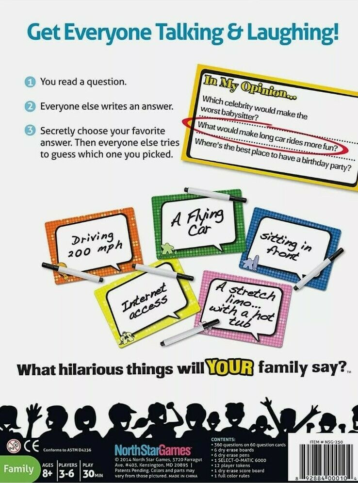 This party game gives players the chance to settle questions that have been hotly debated for centuries. For instance, “Which celebrity would make the worst babysitter?” or “What magical power would be the coolest to have?” The best thing about Say Anything Family: there are no right or wrong answers – just your opinions. This is every family’s chance to Say Anything.