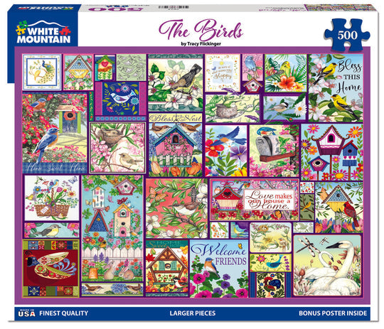 Birds – Spring has sprung. Flowers are blooming, birds are chirping, and butterflies flutter through the air. Designer Tracy Flickinger has perfectly captured the essence of Spring in this 500 piece jigsaw puzzle. Finished size of 18” x 24”.