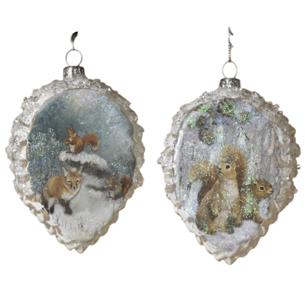On the other hand, the Frosted Pinecone Ornament with Squirrel Family showcases a charming scene of a squirrel family within a winter wonderland. This delightful design adds a charming touch to your holiday decor while celebrating the enchanting wildlife that thrives during the colder months. Crafted from glass and kissed with a frost finish, this ornament is sure to bring warmth and nostalgia to your festive settings.