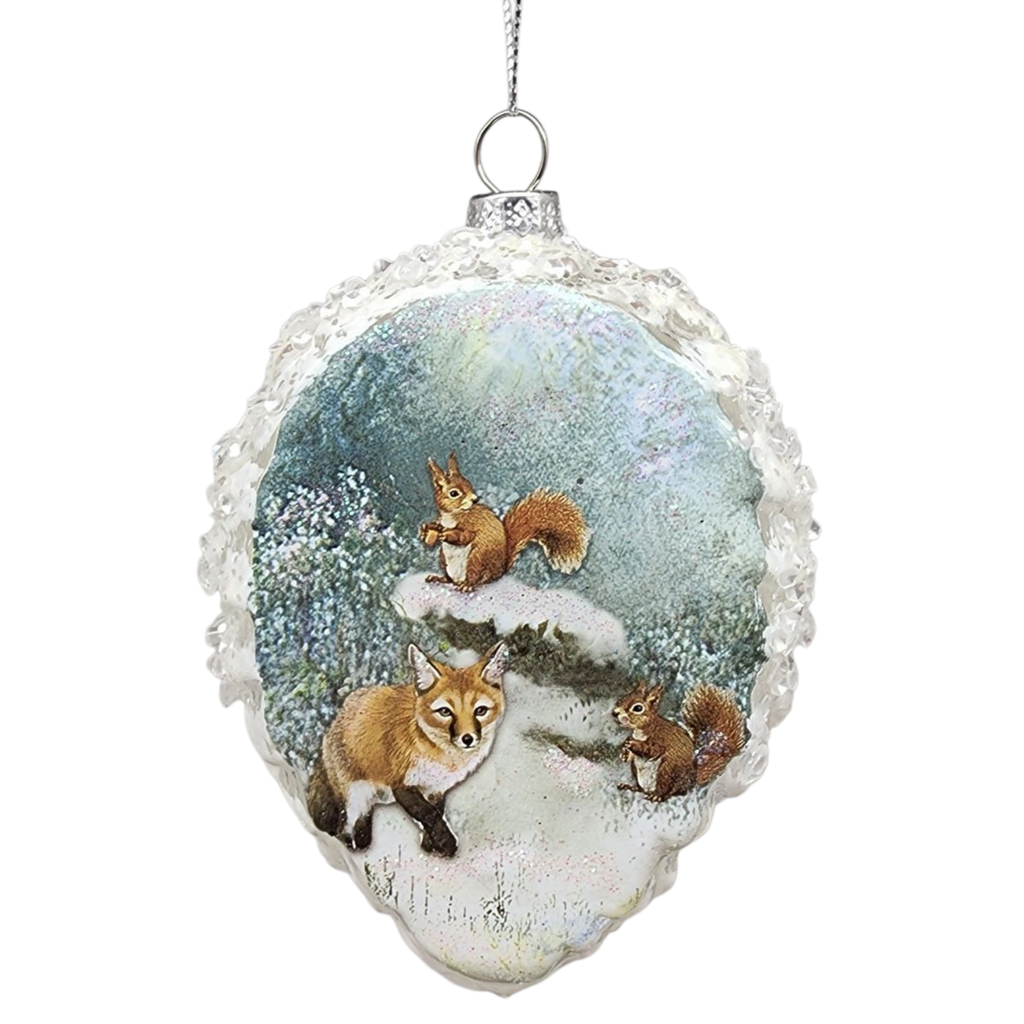 Add a touch of winter whimsy to your holiday decor with our beautiful Frosted Pinecone Ornaments, sold separately! The Frosted Pinecone Ornament with Woodland Scene features a picturesque depiction of playful foxes enjoying the snowy landscape, evoking a sense of serenity and enchantment. Measuring 4.5" x 3.5" x 2.5", this glass ornament captures the magic of the forest, beautifully finished with a frosted effect that sparkles in the light, making it an eye-catching adornment on your tree or as part of a seasonal display.
