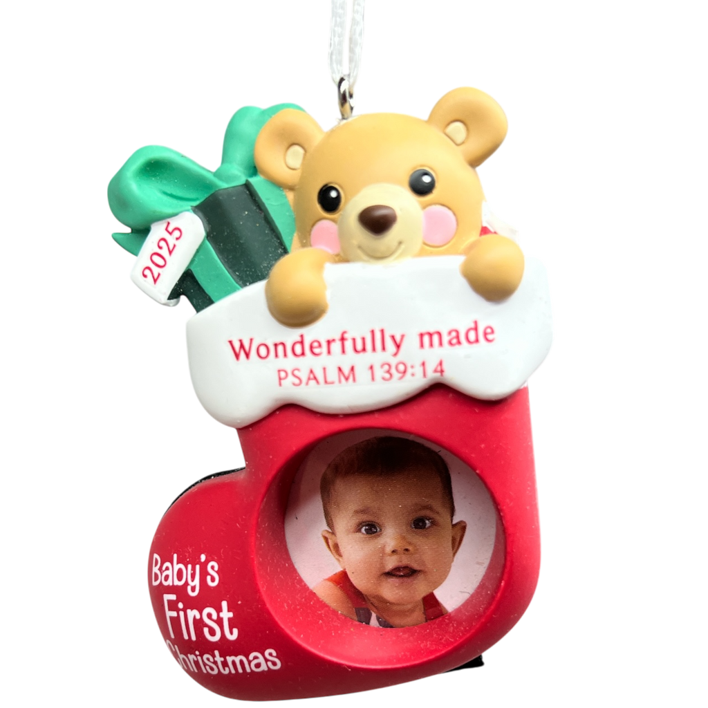 Cherish the precious memories of your little one's first holiday season with the delightful Wonderfully Made Baby's First Christmas 2025 Photo Frame Ornament! Standing at 3 inches tall and 2.25 inches wide, this charming ornament is crafted from high-quality resin and features an adorable teddy bear nestled in a festive stocking. The ornament is adorned with the heartfelt message "Wonderfully made" alongside "Psalm 139:14," making it a beautiful keepsake for new parents to celebrate their bundle of joy.