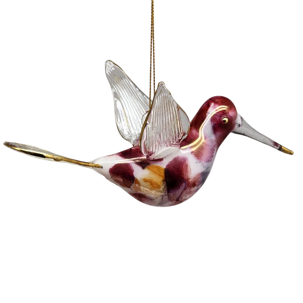 Deck your holiday space with the striking "Crimson Blossom" Blown Glass Hummingbird ornament, beautifully crafted in Egypt. Each piece is a unique treasure, made using the traditional technique of mouth-blown glass which results in a vibrant design filled with rich crimson, deep wine, and shades of soft gold. The real gold accents bring a luxurious touch, making this ornament not just a decoration, but a statement piece that radiates warmth and cheer during the festive season.
