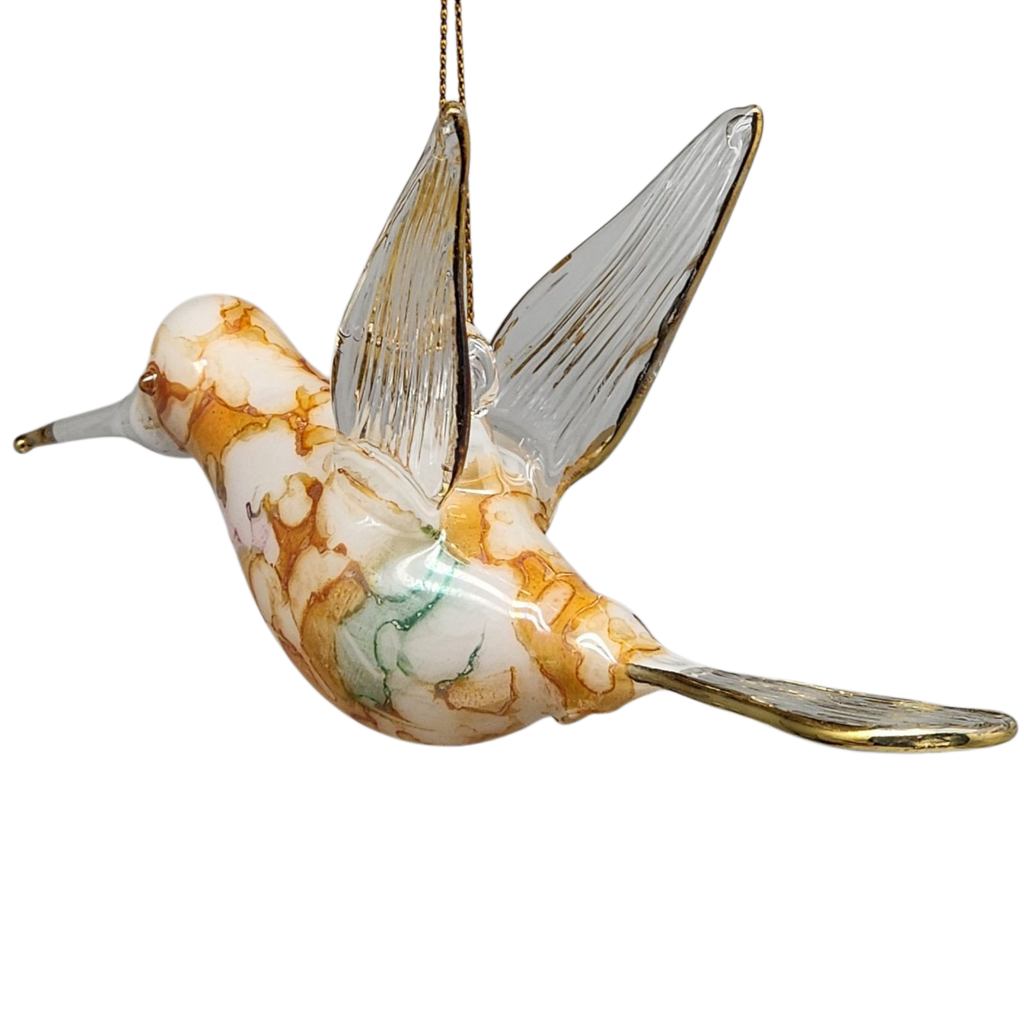 Introduce a touch of elegance to your holiday decor with the enchanting "Golden Petal" Blown Glass Hummingbird ornament. Handcrafted in Egypt, this exquisite piece features beautiful shades of soft white and pastel hues, intertwined with rich gold accents that create a stunning visual effect. The delicate artistry of mouth-blown glass captures the essence of these exquisite birds, making this ornament not only a decoration but a heartfelt symbol of joy and beauty during the festive season.