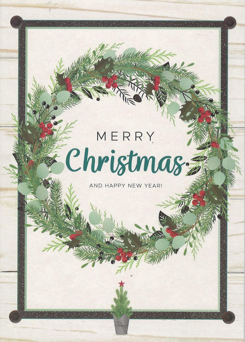 Celebrate the season with timeless elegance using this boxed set of 18 holiday cards featuring a classic wreath of green foliage and red berries. The front reads “MERRY Christmas AND HAPPY NEW YEAR!” in festive red and black lettering, framed by the natural beauty of winter greenery. The industrial farmhouse style adds a rustic charm, making these cards perfect for sending warm wishes to friends, family, and colleagues.