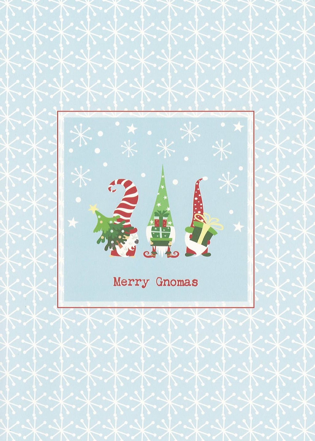Add a touch of whimsical charm to your holiday greetings with our delightful "Merry Gnomas" Greeting Cards. Each 5" x 7" card features a trio of festive gnomes decked out in holiday attire, surrounded by playful snowflakes on a light blue background. This fun and cheerful design is sure to bring a smile to the face of any recipient, capturing the light-hearted spirit of the season.