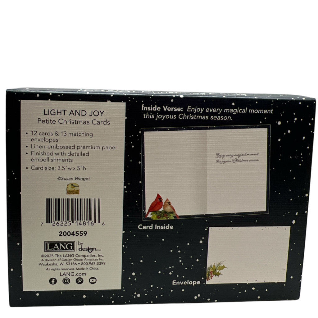 Light and Joy Petite Christmas Cards are a special way to send holiday greetings. Decorated with artwork by Susan Winget, these cards feature linen embossed paper stock, matching envelopes and foil embellishments. You'll receive 12 cards and 13 envelopes in a coordinating box with acetate lid.
