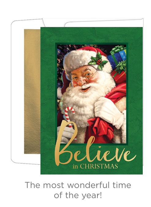 Celebrate the magic of the season with Believe in Christmas Santa, a nostalgic design from the Luxury Favorites collection. Santa smiles warmly beneath a starry sky, holding a sack of gifts and a candy cane, framed by wrapped presents and a textured green border. Gold lettering and a coordinating foil-lined envelope complete this oversized card, perfect for sharing joy and tradition.