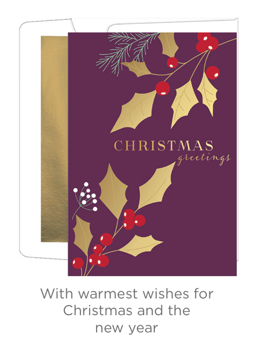 Send a message of warmth and tradition with Christmas Greetings Holly Night, a classic design from the Luxury Favorites collection. Set against a rich purple backdrop, this card features gold and white lettering surrounded by holly leaves, red and white berries, and pine branches. The coordinating gold foil-lined envelope adds a touch of elegance to this oversized holiday greeting.